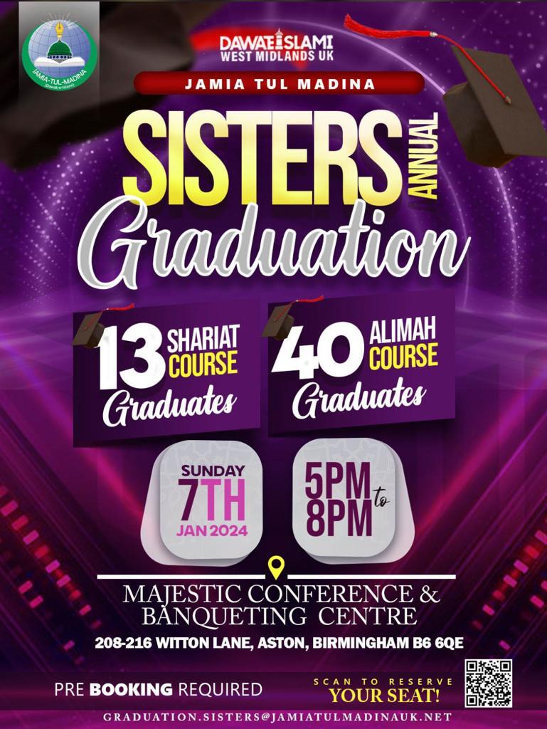 Dawat-e-Islami provides a 5-year Alima course full-time, enriching the lives of Islamic sisters with Fard knowledge & advanced Islamic education.  Sisters are taught Classical & conversational Arabic along with in-depth studies of the Holy Quran & blessed Hadith.  This course runs Mon-Fri, 9.30am till 2.30pm.